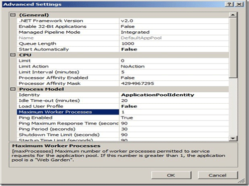 只要服务器资源允许,就可以建立Web garden,在同一个服务器上多开几个工作者进程。32位Windows上一个进程通常只能占用2G-3G内存(因为高地址的2G或者1G是Windows本身用来装配系统文件用的)。64位Windows上一个进程能占用的内存相对32位大一点,但是服务器有比如100多G的内存,可以适当多开几个工作者进程。这可以增加单台服务器的处理能力。要设置Web garden可以先在IIS管理器里面找到对应的应用程序池,在查看该应用程序池的高级属性,再找到最大工作者进程参数,见图。