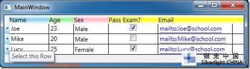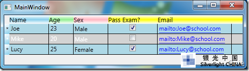其效果如下图所示,Name、Age、Sex 列会按各自的样式显示。未定义样式的Pass Exam 和Email 列将按<DataGrid.ColumnHeaderStyle>全局定义显示,并且当鼠标移置到这两列上方时会有"Sort by Column"提示信息。