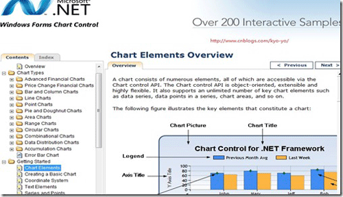 MSChart分为2个部分,一个是winforms版本,另一个是webform版,并且都提供了相应的示例程序(超过200个示例代码,并包括C#版本和VB.NET版本,其中内置了多种图表类型,基本上涵盖了各行各业的所需的图表类型),使得开发者可以根据需求快速的找到自己所需的图表类型,同时查看示例代码可以马上上手进行开发,如下图: