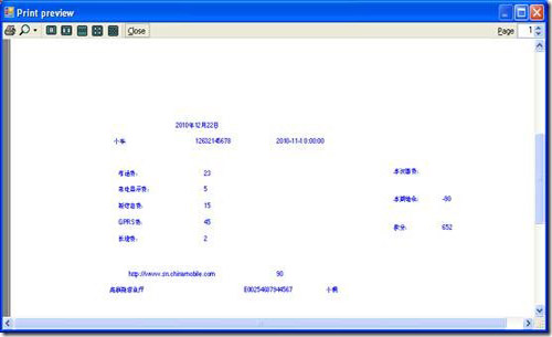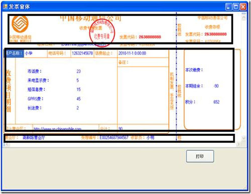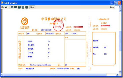 如果你已经熟悉了MultiRow的结构,你肯定知道MultiRow有三种Section,ColumnHeader,Row以及ColumnFooter,前面演示的示例只使用了Row,没有ColumnHeader和ColumnFooter,下面创建的一个模板,是一个移动通信的发票,有ColumnHeader和ColumnFooter,这个示例将会在后续的博文中详细讲述如何使用MulitRow来制作。运行起来的效果如下所示:
