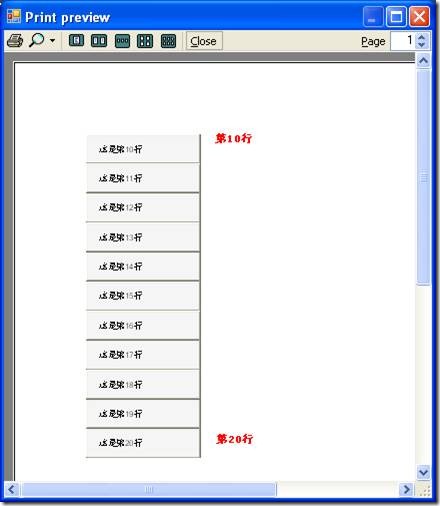 通过设置PrintRange你可以选择打印的时候,只打印你想要的Row,比如PrintRange为AllRows,所有的Row将会被打印到页面;为SelectedRows时,只打印你当前在GcMulitRow控件上面选中的Row;为CurrentRow,只打印CurrentCell所在的Row;为SomeRows的时候,你可以设置另外两个属性,FromRow和ToRow,指出Row的索引,指定从那行开始打印,结束于哪行。比如基于上面的例子,FromRow为10,ToRow为20,那么页面上只打印10到20之间这十个Row: