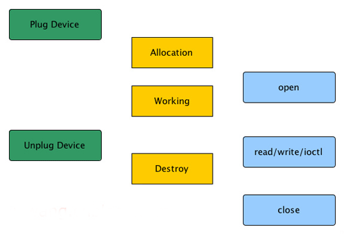 如上图所示,最左边的绿色框图表示实际设备的插拔动作,中间黄色的框图表示内核中设备对象的生存周期,右边蓝色的框图表示用户程序系统调用的顺序。如果用户程序正在访问的时候设备突然被拔掉,驱动程序里的设备对象是否立刻释放呢?如果立刻释放,用户程序执行的系统调用一定会发生内存非法访问;如果要等到用户程序close之后再释放设备对象,我们应该怎么来实现?kref就是为了解决类似的问题而生的。