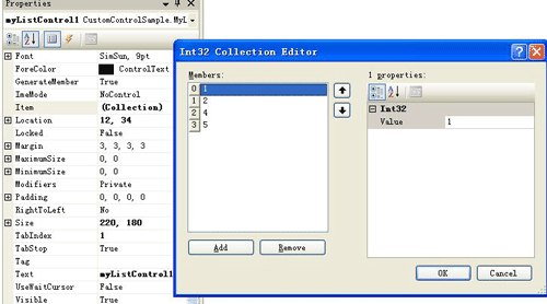 在这个控件中,我声明了一个集合属性Item供用户输入要显示的整型数值。我们按照winform控件制作教程(二)中的方法将控件加到ToolBox里,然后拖到Form设计器中,然后选中控件,在属性浏览中查看控件的属性,属性中有一个Item的属性,属性右边的值显示为Collection,当你点击这个值的时候,值的右边出现一个小按钮,点击这个小按钮,就会出现弹出一个Collection Editor窗口,你可以在在这个编辑器里添加你想显示的整型值,如图: