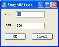 在这个对话框里,我们要把OK按钮的DialogResult属性设为OK(当点击OK按钮时,模态对话框关闭,并返回DialogResult.OK),将Cancel按钮的DialogResult属性设为Cancel(当点击OK按钮时,模态对话框关闭,并返回DialogResult.OK)。另外我们要对用户输入的值做验证,以保证Scope的min和max值都是Int32类型。下边是对话框的代码: