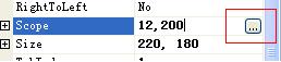 我们在Scope属性前加上了[Editor(typeof(ScopeEditor),typeof(UITypeEditor))]元数据。Build工程,查看实际的效果。在测试工程的窗体上,选中控件,观察Scope属性,当我们单击Scope属性的值时,在属性值的后边出现了一个按钮,如图: