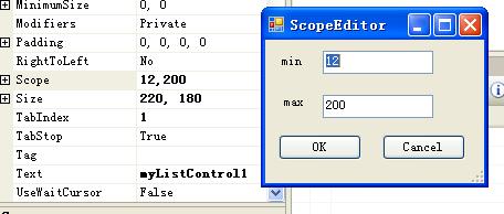 在这个类里,我们重写了两个方法,一个是GetEditStyle,在这个方法里,我们通知开发环境,属性的编辑器是一个模态对话框。另一个方法是EditValue,这是最核心的方法,在这个方法里,我们通过上下文环境获得了正在编辑的控件的实例,并将实例的Scope属性传递给属性编辑对话框,显示对话框供用户编辑属性的值,用户编辑完属性的值,并关闭对话框,这时,我们从对话框里获取编辑后的结果反会给开发环境。 编写完Editor,我们就要将它应用到MyListControl的Scope属性上,现在的Scope属性定义如下: