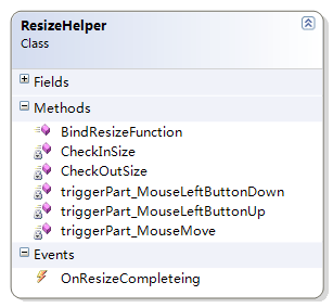由下面的类图可知:ResizeHelper只对外公开一个方法BindResizeFunction,这个方法有两个参数,一个是触发鼠标左键按下事件的锚点对象,另一个是需要改变尺寸的主体控件。
