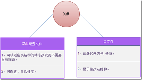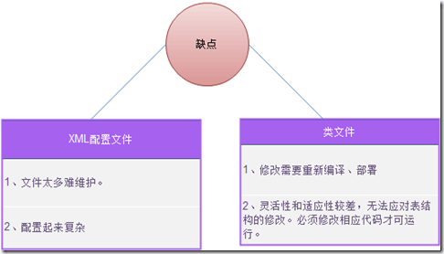 我们比较常见的方式目前就这样的2种方式,第一种方式想必大家都比较了解的,无论是JAVA中的Hibernate还是.NET中的Nhibernate都是这样的方式,以XML文件的方式把数据库中的表列属性与实体的属性一一对应。第二种方式则是在类文件中硬编码书写数据库列与实体之间的映射关系。