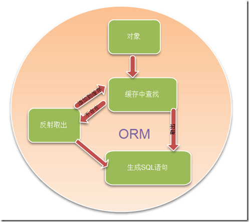 我们知道,我们第一篇中主要是通过自定义特性+反射的形式来处理:我们并没有提供完整的特性操作,其实还有很多的情况,比如说,我们还可以提供对视图的映射,提供一个视图的特性等。还有其他的特性有很多,后续会给出完整的代码结构,我们知道自定义特性+反射,如果每次在将对象映射成数据库表的时候,那么效率上是多么的低下啊,那么这个时候,我们可以考虑使用缓存的方式,将数据库表中的数据库列与对象中的属性列进行映射,我们可以把这些对应关系放在缓存中,那么如果我们在后续的处理中遇到与数据库相关操作,需要进行对象映射的时候,我们都先会去缓存中查找有没有指定键值的映射数据库表列存在,存在取出生成SQL语句,否则通过反射取出对应的数据库表列,放在缓存中。下面给出示意图。将这个过程进行描述:
