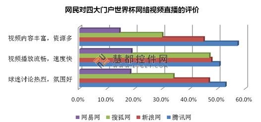 小组赛期间,赛事视频直播最受网民关注,数据显示,52%网民使用腾讯网收看世界杯网络视频直播,超出其他门户网站。在“视频内容丰富,资源多”,“视频播放流畅,速度快”,“球迷讨论热烈,氛围好”三项指标上,腾讯网都以绝对优势领先其他门户网站。