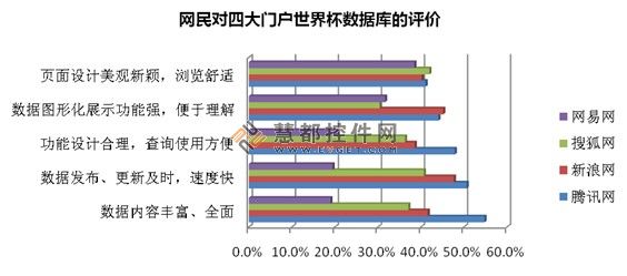 腾讯网世界杯赛事数据库也赢得了网民的认同,46%网民表示,小组赛期间通过腾讯网来查询世界杯赛事数据。在四大门户数据库使用调查中,在数据内容丰富、全面,数据发布、更新及时、速度快,功能设计合理、查询使用方便等几项核心指标上,腾讯网均名列第一,得到网民认可。