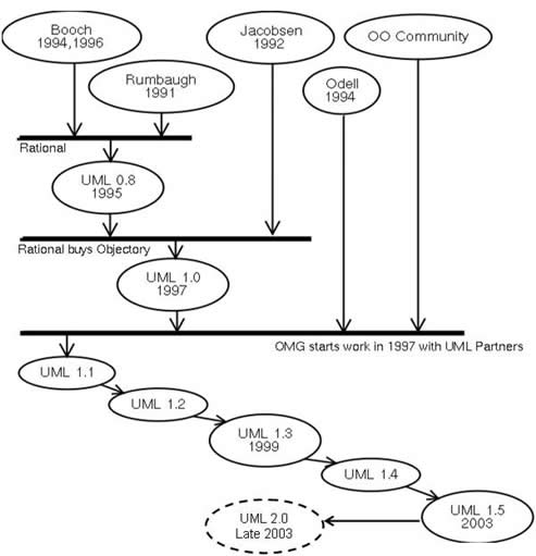1997年,OMG组织(Object Management Group对象管理组织)发布了统一建模语言(Unified Modeling Language,UML)。UML的目标之一就是为开发团队提供标准通用的设计语言来开发和构建计算机应用。UML提出了一套IT专业人员期待多年的统一的标准建模符号。通过使用UML,这些人员能够阅读和交流系统架构和设计规划--就像建筑工人多年来所使用的建筑设计图一样。