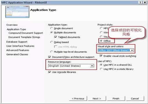 在接下来的“MFC应用程序向导”中,我们就可以对项目的可视化风格进行选择和配置。Visual Studio 2010支持MFC风格、标准的Windows风格,Visual Studio 2005风格和Office 2007风格。而这里的Office 2007风格,就是我们要创建的Ribbon界面: