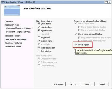 到这里,针对新项目的设置就完成了,点击“Finish”按钮关闭应用程序向导,Visual Studio 2010就会按照我们的设置创建相应的MFC应用程序解决方案。编译运行这个解决方案,我们就得到了第一个具有Ribbon界面的应用程序。