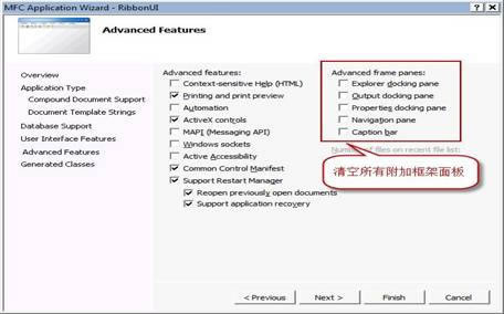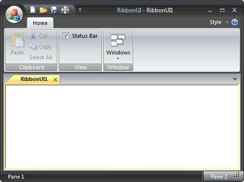 为了支持丰富的Office 2007界面风格,MFC默认情况下为MFC文档应用程序添加了类似Outlook风格的导航面板(Navigation pane)和标题条(Caption bar)。这两者并不是我们关注的重点,为了更好的展示Ribbon界面,我们这里就去掉这两个多余的面板: