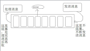 android 在设计的时候引入了 wince 的消息机制,即将每一个消息发送到队列里面,遵循先进先出原则。发送消息并不会阻塞线程,而接收线程会阻塞线程,这是因为 Android 的Handler 机制,当Handler 处理完一个 Message 对象才会接着去取下面一个消息进行处理,如下图: