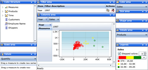 OLAP + CHART ModelKit由Perpetuum Softwar开发,在OLAP工具中有一定的知名度,OLAP + CHART ModelKit 包含:OLAP ModelKit用于多维数据分析的 OLAP 组件;Chart ModelKit用于图形化数据显示组件。这两个组件集成以交互图表和图形的形式提供了一个高级和直观的用户界面,专为 OLAP 绕轴旋转、切片、下钻和数据可视化所设计。OLAP 技术的功能、序列类型的富库和能够使用任何 .Net 数据源的特性,使得创建高效决策支持系统成为可能。
