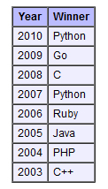 Tiobe发布了2011年度的第一期编程语言排行榜,在本期榜单中前五名是Java、C、C++、PHP和Python。出人意料的是Python超越了C#排到了第五名,它也以2010年增速1.81%的成绩压倒Object-C成为2010年度编程语言。