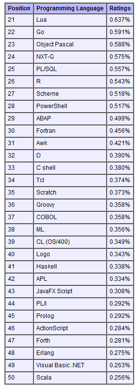 下面是本期榜单第21-50的编程语言排名,Go语言小幅下降,Lua不知能否进入前20。