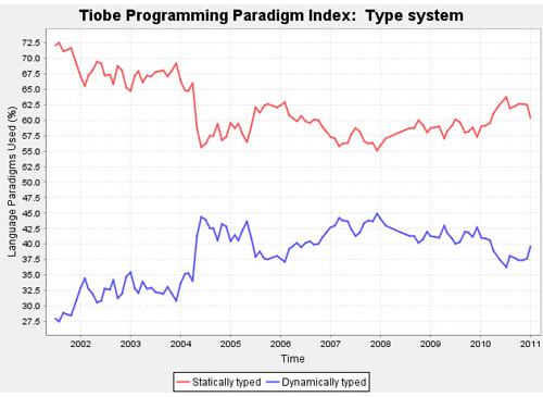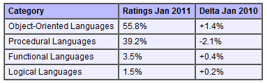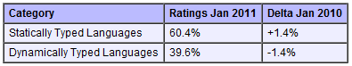 概述:Tiobe发布了2011年度的第一期编程语言排行榜,在本期榜单中前五名是Java、C、C++、PHP和Python。出人意料的是Python超越了C#排到了第五名,它也以2010年增速1.81%的成绩压倒Object-C成为2010年度编程语言。