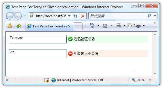 通过这样的方式,我们就可以在Silverlight中对于数据输入做验证了。