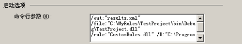 2、将命令行参数修改成:out:"results.xml" /file:"C:\MyRules\TestProject\bin\Debug\TestProject.dll" /rule:"CustomRules.dll" /D:"C:\Program Files\Microsoft FxCop 1.36"