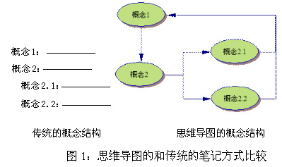 思维导图是英国人托尼•巴赞创造的一种提出笔记方法,和传统的直线记录方法完全不同,它以直观形象的图示建立起各个概念之间的联系(如图1所示)。