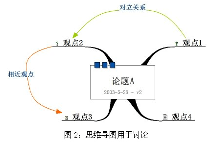 其实,思维导图不仅可以用于做笔记,还在制定计划、组织讨论等方面有用途。例如讨论问题时,可以由一人担任秘书工作,把整个讨论用思维导图的形式画出来。(如图2所示)