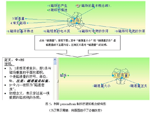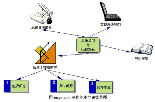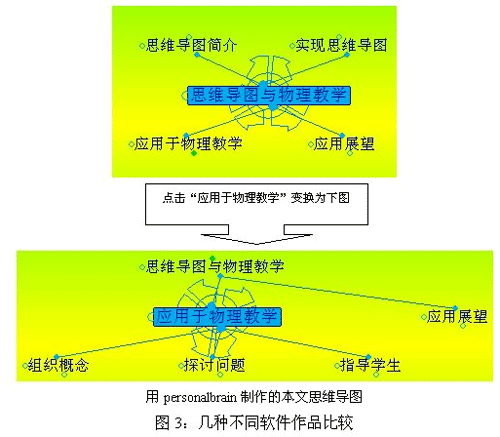 计算机已经在许多方面取代了"纸+笔",在制作思维导图上,计算机也以它的操作快捷、图象形式多样和容量大的特点显示了比"纸+笔"工具的优势。现在,制作思维导图的软件很多,如inspiration、mindmanager、personalbrain、brainstorm等,这些软件互有优缺点,在实际应用中可以根据需要进行选择。图3是利用不同软件制作的本文结构图,从中可以比较出它们的表达方式的特色。这些软件都非常容易掌握,因此不仅是教师可以使用,学生也可以使用,为学生学习又提供了新的工具。