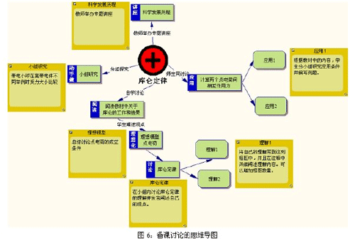 备课是重要教学行为,如何才能提高备课的效果呢?除了教师自己认真研读教材、教学大纲、查阅有关资料之外,教师之间的讨论也是提高备课效果的重要方式,这样可以做到集思广益,智慧大家共享。然而在通常的备课过程中由于缺乏及时有效的记录和整理,集体讨论效果不好,而且容易跑题。现在我们按照思维导图的方法,利用inspiration软件记录备课过程,然后进行必要的整理,就避免了上述情况,图6是在一次集体备课中讨论"库仑定律"的教学时最终绘制的思维导图。