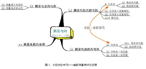 在探究式课堂教学中,学生以小组为单位进行讨论是非常普遍开展的一种学习方式,然而也同样会出现我们前面所说的讨论中出现的问题,在讨论式教学中教学效率不高的现象是普遍存在的,要改变这种情况,只有将学生的注意力全部集中到讨论的中心话题上来,这正是思维导图解决的问题,同时利用适合的软件,还可以及时记录下讨论结果,体现集体思维的成果。在教学中,我们一般是首先筛选探究的问题,有些问题值得讨论,有些讨论的价值不高,在这方面要发挥教师的主导作用,课前进行筛选。在课堂上,学生分小组学习,每个小组至少一台计算机,一个学生作为小组的书记员,记录大家的讨论结果,因为考虑到mindmanager十分便于快速记录,所以我们在这样的课上多使用这个软件。图7就是高三学生在进行"测量电阻"专题复习时一个小组的课堂讨论记录。