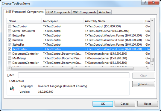 在Visual Studio的工具箱中点击鼠 标右键,选择右键菜单中的 【Toolbox Items】菜单项,在弹出的【Choose Toolbox Items】对话框中,选择【.NET Framework Components】Tab页,点击【Browse】按钮指定TX Text Control .NET 的安装路径(例如:C:\Program Files\The Imaging Source Europe GmbH\TX Text Control 16.0.NET for Windows Forms\Assembly\),然后选择TXTextControl.Windows.Forms.dll文件。