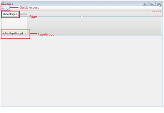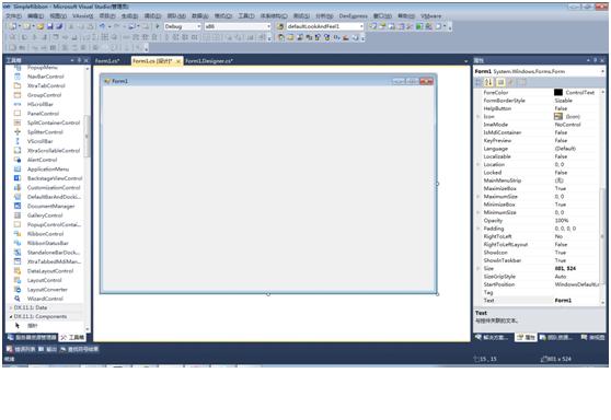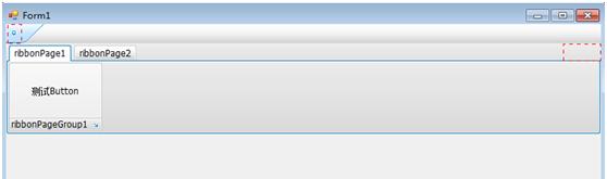 从左边的工具箱中拖一个 RibbonControl组件放置到Form上,RibbonControl自动停靠到Form靠上的位置,如下图所示: