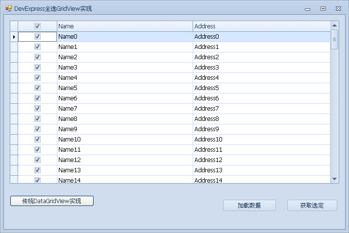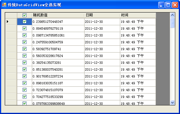 基于以上需求,找了不少例子进行比较,并对代码进行测试改进,终于完成了以上的功能了, 并且由于我本身做了多套界面的处理,因此,基于传统的DataGridView全选操作不能少,而且基于DevExpress控件的GridView全选操作也应该支持,呵呵。