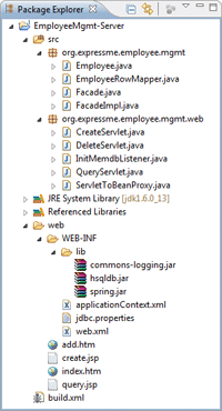这是一个典型的 Java EE 应用,使用了流行的 Spring 框架。为了简化数据库操作,我们使用了内存数据库 HSQLDB。对这个简单的应用,省略了 DAO,直接在 Façade 中通过 Spring 的 JdbcTemplate 操作数据库。最后,EmployeeMgmt 应用通过 Servlet 和 JSP 页面为用户提供前端界面: