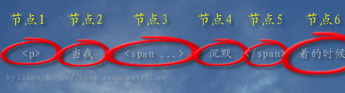 为了再次简化编程模型,我(liigo)继续将“开始标签”“结束标签”“普通文字”三者统一抽象归纳为“节点”(HtmlNode),相应的,“节点”有三种类型,要么是开始标签,要么是结束标签,要么是普通文字。现在,HTML在我们眼里更加单纯了,它就是“节点”的线性顺序组合,是一维的“节点”数组。如下图所示:HTML文本 = 节点1 + 节点2 + 节点3 + ……