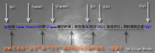 众所周知,HTML是结构化文档(Structured Document),由诸多标签(<p>等)嵌套形成的著名的文档对象模型(DOM, Document Object Model),是显而易见的树形多层次结构。如果带着这种思路看待HTML、编写HTML解析器,无疑将导致问题复杂化。不妨从另一视角俯视HTML文本,视其为一维线状结构:诸多单一节点的顺序排列。仔细审视任何一段HTML文本,以左右尖括号(<和>)为边界,会发现HTML文本被天然地分割为:一个标签(Tag),接一段普通文字,再一个标签,再一段普通文字…… 如下图所示: