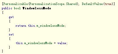 可是在SharePoint中的SilverLight WebPart属性设置面板里找不到该属性。用Reflector看了下这个WebPart,其实是有个属性叫WindowlessMode的,只不过特性里没加可视化显示出来。