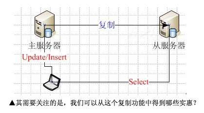 如上图所示,可以定期的将数据从主服务器上复制到从服务器上,这无疑是先了数据的异地备份。在传统的备份体制下,是将数据备份在本地。此时备份作业与数据库服务器运行在同一台设备上,当备份作业运行时就会影响到服务器的正常运行。有时候会明显的降低服务器的性能。同时,将备份数据存放在本地,也不是很安全。如硬盘因为电压等原因被损坏或者服务器被失窃,此时由于备份文件仍然存放在硬盘上,数据库管理员无法使用备份文件来恢复数据。这显然会给企业带来比较大的损失。