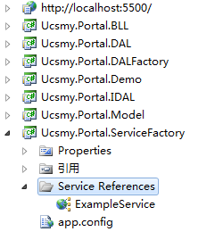 在原代码中,在下以Ucsmy.Portal.ServiceFactory实现Service Interface层,其实这个ServiceFactory没有太多工作,只是对WCF添加服务引用,然后直接生成DLL即可。当然这只是初步的做法,在日后完善代码的时候,这一层还需要对WCF的生命流程进行管理。