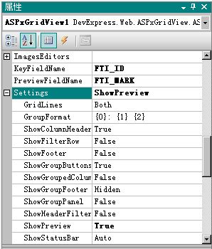 3、设置grid的数据源为objds,此时grid会自动绑定所有列。为了展示较长字段,必须制定为PreviewRow赋值为一列名,并且让 PreviewRow显示。如下图设置。我这里是PreviewFieldName="FTI_MARK",<Settings ShowPreview="True" />