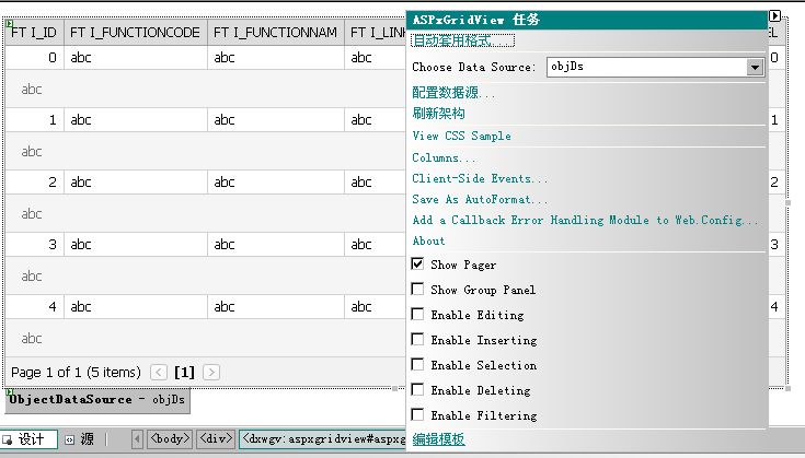 1、拖放一个ASPxGridView(重命名为grid)和ObjectDataSource(重命名为objds) 到页面。