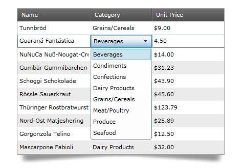 有了组合框栏,你可以轻松地将Silverlight组合框控件嵌入到Silverlight网格控件的单元格中。