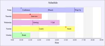 Bar charts 注释类可让你创建一个可供你选择标签,位置,颜色和形状的bar注解。BarSeries.Annotations属性拥有bar系列的所有注解。你可以使用你的bar来显示你尚未完成的进度。你可以为每个bar设置一个可显示bar当前状态的值,当进度达到状态值时,会出现一个着色的点。 |