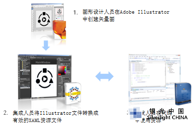 把它们联系在一起就成为了一个强大的工具包。以下图例展示了一个工作流程示例,它把图形设计人员在Adobe Illustrator里创建的向量图集成到了VisualStudio解决方案中的一个WPF项目里。
