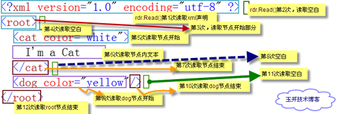 从图中可以看到XmlReader在读取这段Xml时: 第1次Read()读取的是Xml文档声明部分 第2次Read()读取的是声明后的空白 第3次Read()读取的是根节点root的开始标签 第4次Read()读取的是根节点开始后的空白 第5次Read()读取的是cat节点的开始部分,从左尖括号到右尖括号包括该节点的属性 第6次读取的是cat节点的内容 第7次读取的是cat节点的结束标签 第8次读取的是cat节点结束标签后的空白 第9次读取的是dog节点的开始部分,注意是从左尖括号开始到结束斜杠之前 第10次读取的是dog标签的结束/> 第11次读取的是dog标签结束后的空白 第12次读取的是root的结束标签