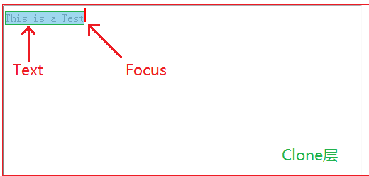 而对于firefox之类的浏览器则通过模拟来实现,如下图所示。首先通过拷贝输入区域的样式到一个div层(clone层),然后在此clone层之中的text子层添加光标之前的字符,并在text子层之后添加focus层,focus层中包含字符“|”来模拟光标,进而通过获取focus层的偏移量即可获得文本光标的像素坐标位置。