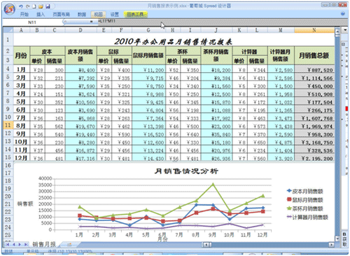 Spread控件是由与滚动条相结合共同来显示数据的表单组成。如果有多个表单,一个标签条里可以有多个标签。 下面的图片显示了Spread控件的主体部分。其中的多个部分可以被隐藏,但这里展示了默认的显示。