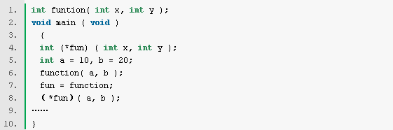 语句1定义了一个函数function,其输入为两个整型数,返回也为一个整型数(输入参数和返回值可为其它任何数据类型);语句3定义了一个函数指针,与int*或double*定义指针不同的是,函数指针的定义必须同时指出输入参数,表明这是一个函数指针,并且*fun也必须用一对括号括起来;语句6将函数指针赋值为funtion,前提条件是*fun和function的输入参数和返回值必须保持一致。语句5直接调用函数function(),语句7是调用函数指针,二者等效。