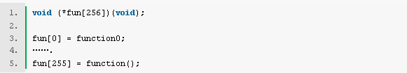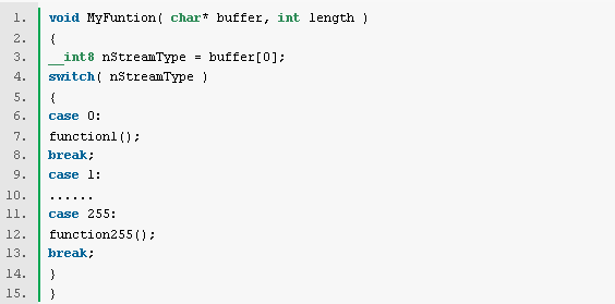只要2行代码,就完成了256条case语句要做的事,减少了编写代码时工作量,将nStreamType作为数组下标,直接调用函数指针,从代码执行效率上来说,也比case语句高。假如多个函数中均要作如此处理,函数指针数组更能体现出它的优势。